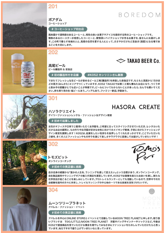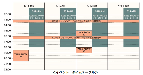 また、4月11日(木)~14日(日)にオープンイベントとして「KO52 TAKAOのジコショー会~個商いビルの、はじめましてのごあいさつ~」と題して出店者にまつわるトークショーや館内ツアーなど、本施設の楽しみ方を知っていただくイベントを開催します。