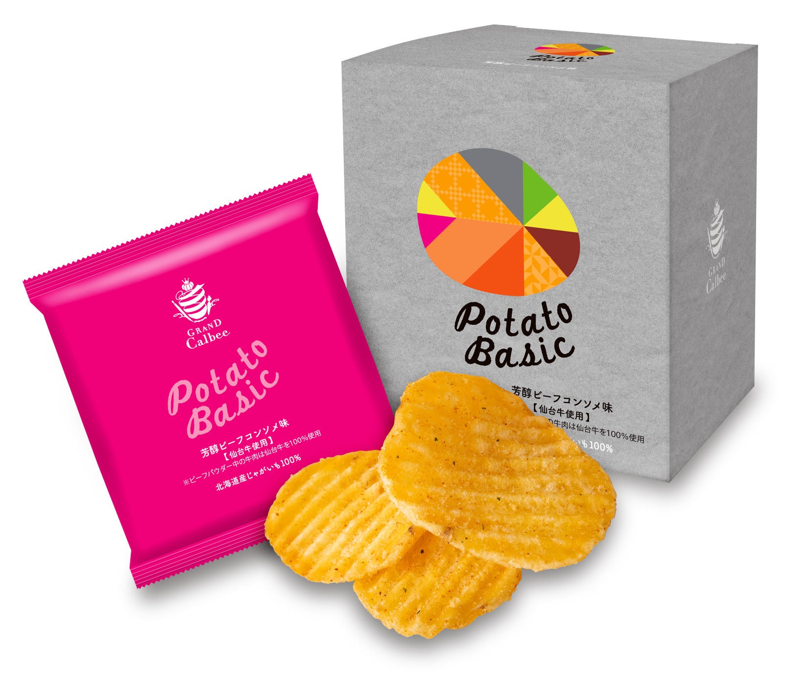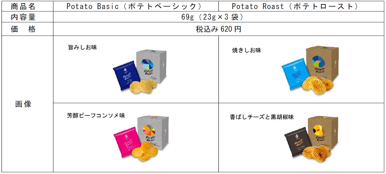 ●「Potato Basic」と「Potato Roast」は、北海道産じゃがいもを使用し、じっくりフライ製法でじゃがいものおいしさを追求した、厚みと食感にこだわったシリーズです。「Potato Basic」の「旨みしお味」はオホーツクの、「芳醇ビーフコンソメ味」は仙台牛など厳選素材を用いて味付けしています。「Potato Roast」は表面を炙った厚切りチップスに香ばしさを際立たせる味わいを施しました。