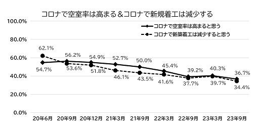 「空室率は高まる」「新規着工は減少する」と思うという回答は、それぞれ初回調査から第9回調査で、54.7%→36.7%、62.1%→34.4%と大きく低下。
