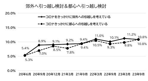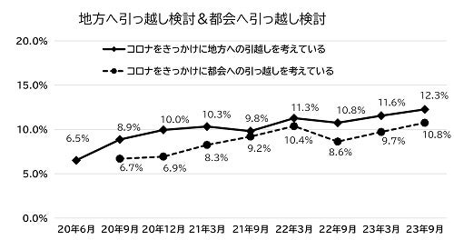 「コロナをきっかけに郊外への引っ越しを検討している」と「コロナをきっかけに都心への引っ越しを検討している」、「コロナをきっかけに地方への引っ越しを検討している」と「コロナをきっかけに都会への引っ越しを検討している」は、1回目調査・2020年6月の緊急事態宣言発出直後の低い水準から上昇しているが、いずれも拮抗している。