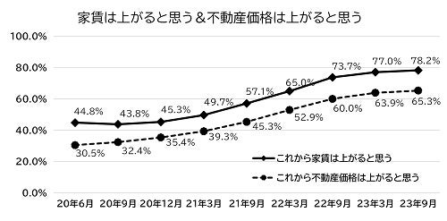 「家賃は上がる」「不動産価格は上がる」と思うという回答は、それぞれ1回目調査から第9回調査で、44.8%→78.2%、30.5%→65.3%と大きく上昇。