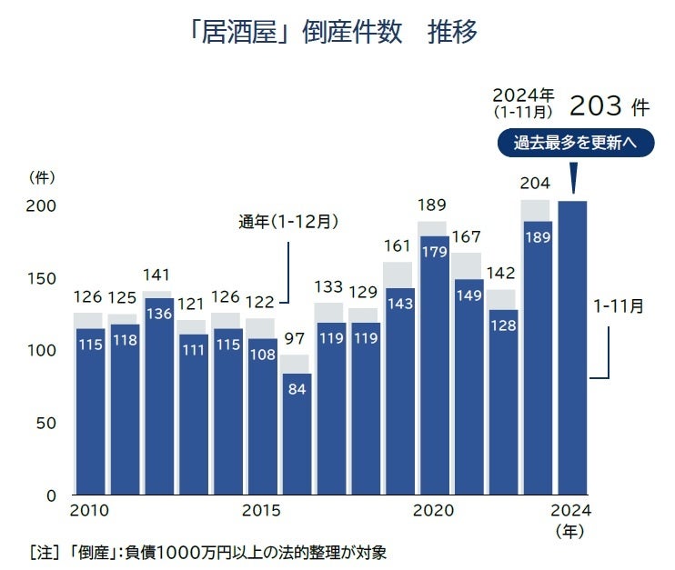 大衆酒場や焼き鳥店など「居酒屋」経営事業者の倒産(負債1000万円以上、法的整理)が、2024年は11月までに203件発生した。コロナ禍の打撃を受けた2020年(189件)を大幅に上回り、年間最多を更新することが確実となった。居酒屋ニーズの変化や酒類・食材など原材料の仕入れ価格高騰、人件費の上昇といったコストアップが重なり、居酒屋各店の苦戦が鮮明となっている。