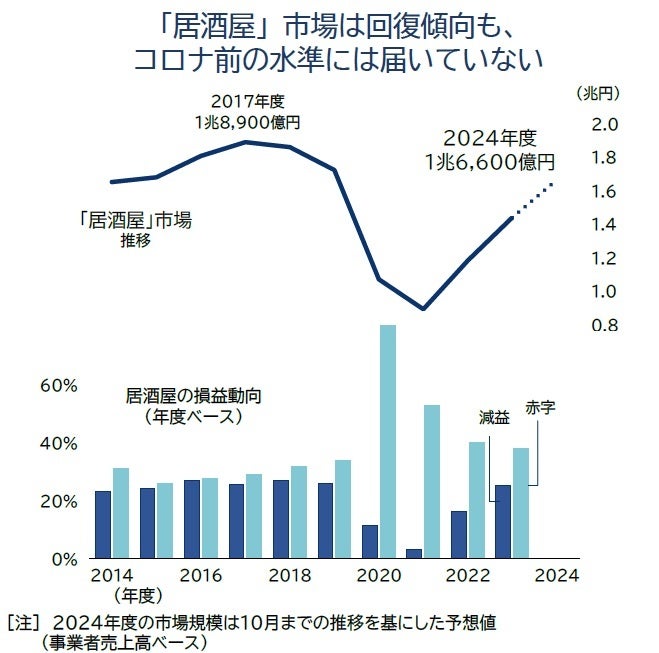 10月までの推移を基にした2024年度の居酒屋市場規模(事業者売上高ベース)は、推定で約1兆6600億円が見込まれる。コロナ禍の影響で大きく落ち込んだ21年度(約8900億円)から年々増加傾向にあるものの、過去10年で最高だった17年度(約1兆8900億円)の水準には届かないとみられる。インバウンド消費の拡大による客数増は好材料となるものの、大規模な宴会から少人数でのカジュアルな飲み会へニーズがシフトしているほか、物価高による節約志向の高まりで来店頻度や単価の低下といった影響を受けている。