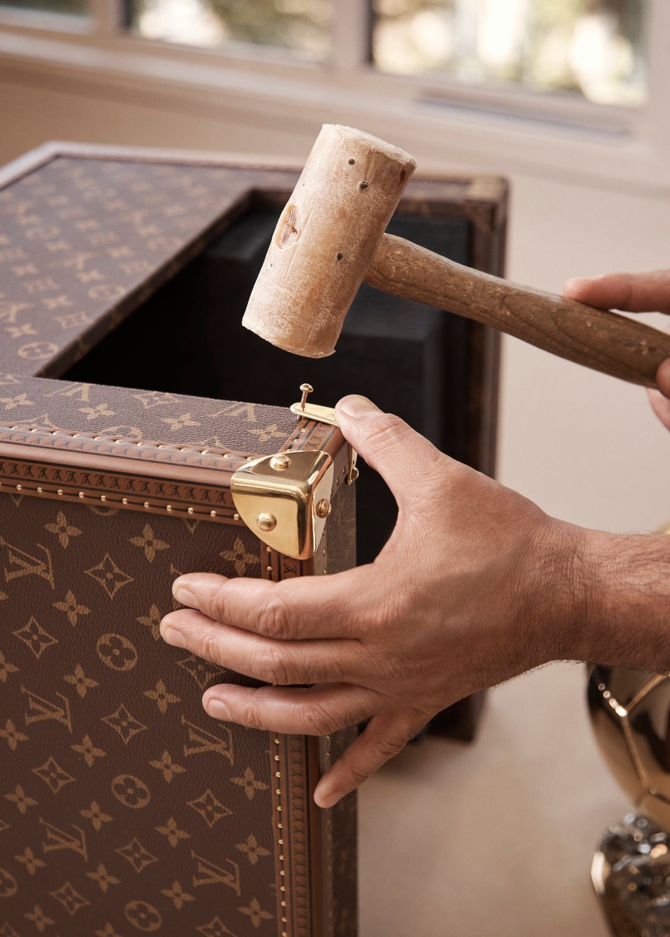 トランクの外装には、ルイ・ヴィトンを象徴するクラシックなロジンのトリミング や、160 年以上にわたりルイ・ヴィトンのトランクに使用されてきたものと同じ真鍮製のコーナープロテクター、ロック、クラスプが使用されています。
