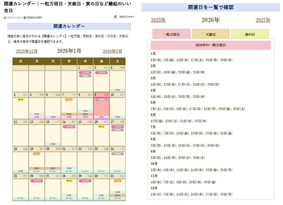 ・コンテンツ名称:開運カレンダー|一粒万倍日・天赦日・寅の日など縁起のいい吉日