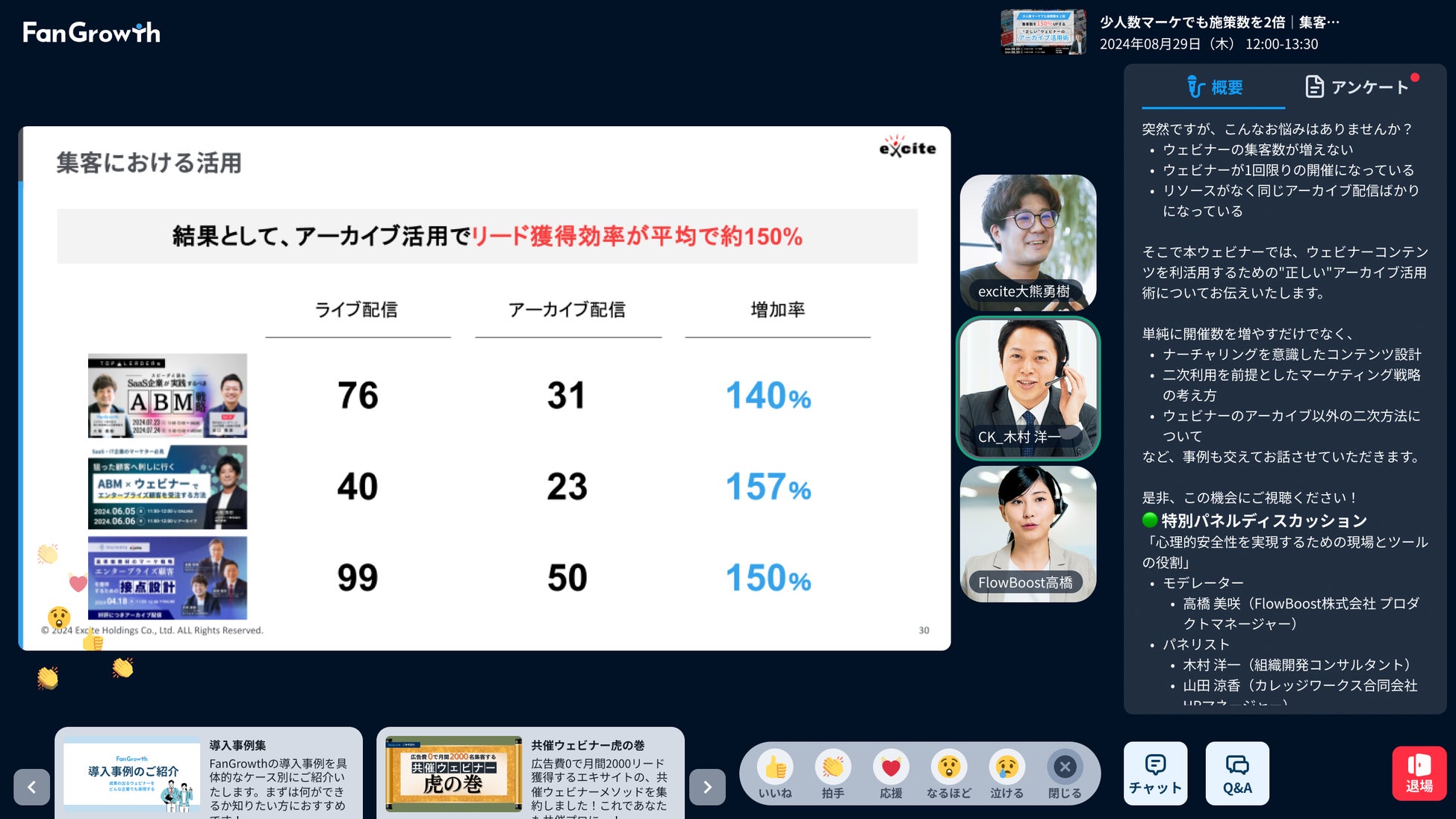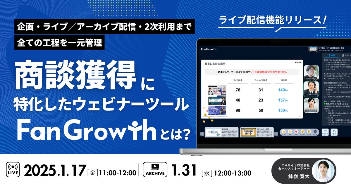 エキサイト株式会社(所在地:東京都港区、代表取締役社長:西條 晋一)は、どんな企業でも売上に繋がるウェビナーを開催できる「FanGrowth」において、BtoBマーケティング施策に特化したライブ配信機能を追加しました。これにより、ウェビナー開催の企画作成からライブ配信、その後の二次利用まで全てのウェビナー工程を一元管理することが可能になります。
