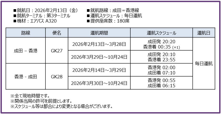 ジェットスター・ジャパン(IATAコード:GK)は、2026年2月13日より、成田=香港線を開設します。