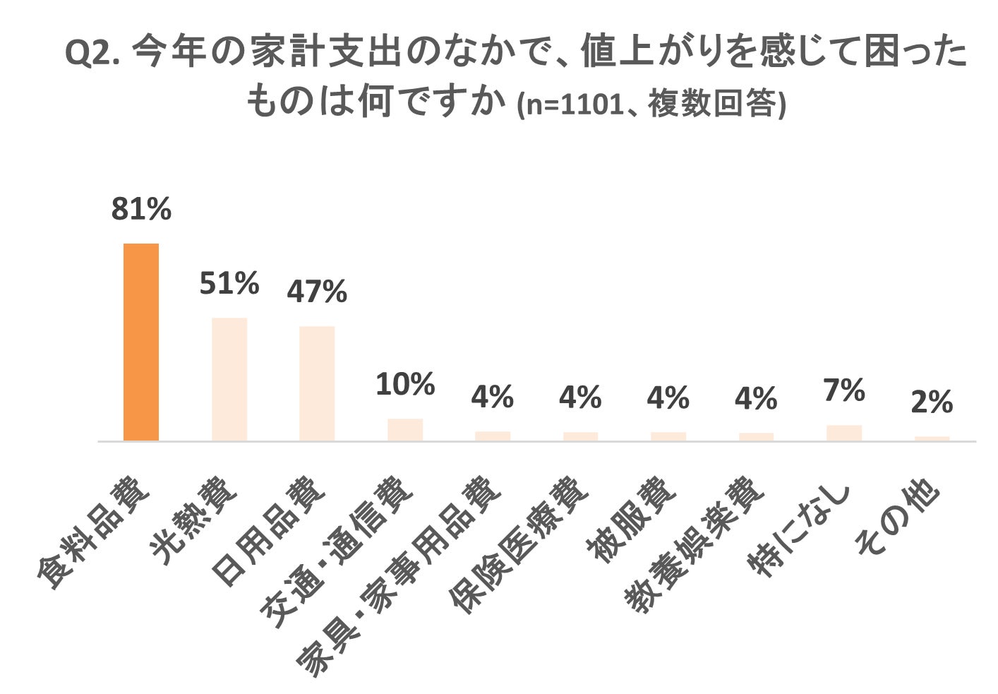 ●87%が1年前(2023年)と比較して今年は物価が上がったと回答(Q1)。値上がりを感じて困ったものは、81%が「食料品」と回答。その他、51%が「光熱費」、47%が「日用品費」と日々使うものに回答が集まった(Q2)。