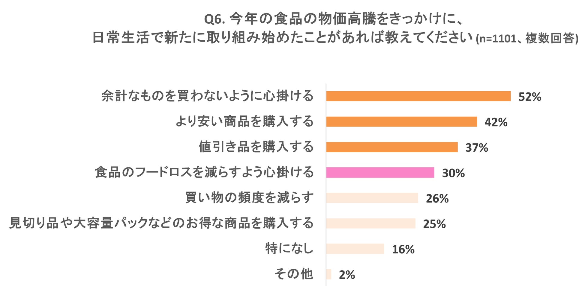 ●今年の食品の物価高騰をきっかけに日常生活で新たに取り組み始めたことを聞いたところ、「余計なものを買わないように心掛ける」(52%)、「より安い商品を購入する」(42%)、「値引き品を購入する」(37%)という支出を押さえる試みの他、「食品のフードロスを減らすよう心掛ける」(30%)という食材の無駄をなくす試みも上位にランクインした(Q6)。