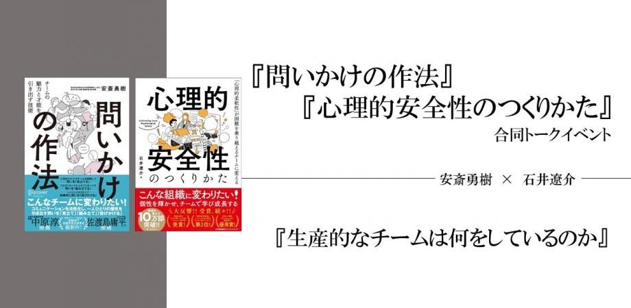 心理的安全性が注目され、より良い組織の構築が進む現代において、人間関係が破綻するリスクを感じることなく、すべての人がチームのために行動する生産的な組織では、一体何を実践しているのでしょうか。本イベントでは著者の安斎勇樹さん、石井遼介さんにご登壇いただき、誰もが良い職場環境を求め、人生の中で仕事の充実度も多く求める中で、これから実践できる組織の運営方法や、「問いかけ」などのコミュニケーションによってもたらされるチームのあるべき姿について伺っていきます。リーダーの方も、これからリーダーを目指す方も、より良い職場環境を求めるすべての方におすすめのイベントです。