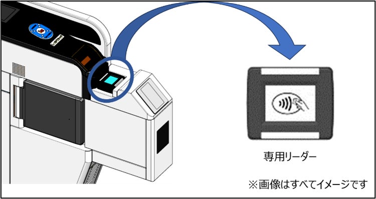 お手持ちのタッチ決済対応のカード(クレジット・デビット・プリペイド)や、同カードが設定されたスマートフォン等を、新たに自動改札機に設置する専用リーダー(※)にタッチすることで、そのまま改札を通過しご乗車いただけます。