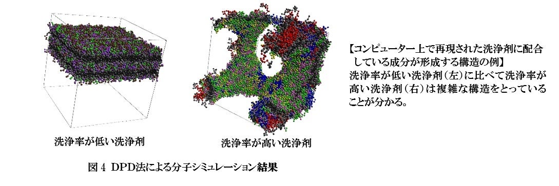 さらなる予測精度向上を目指し、洗浄剤のメイク落としに関するメカニズムを解明しました。洗浄剤のメイクを落とす性能は、製品開発に使用する界面活性剤分子の構造に加え、界面活性剤を形成する集合構造や汚れに対する吸着状態に強く左右されると考えられます。コンピューター上でこれらの影響を検討するために、DPD法8)と呼ばれる分子シミュレーション技術を用いて、モデル洗浄剤の分子シミュレーションを行いました。100種類以上の組み合わせでシミュレーションを行った結果、実際の洗浄率と、汚れに対する吸着の仕方の間に相関があることを見いだしました。さらに洗浄率が高い洗浄剤と低い洗浄剤では、水中で形成される構造に特徴的な違いがあることが明らかになりました(図4)。今後は分子シミュレーションの結果から得られたデータを機械学習に組み込み、洗浄率予測システムの精度向上および実用化に向けた検討を進めていきます。