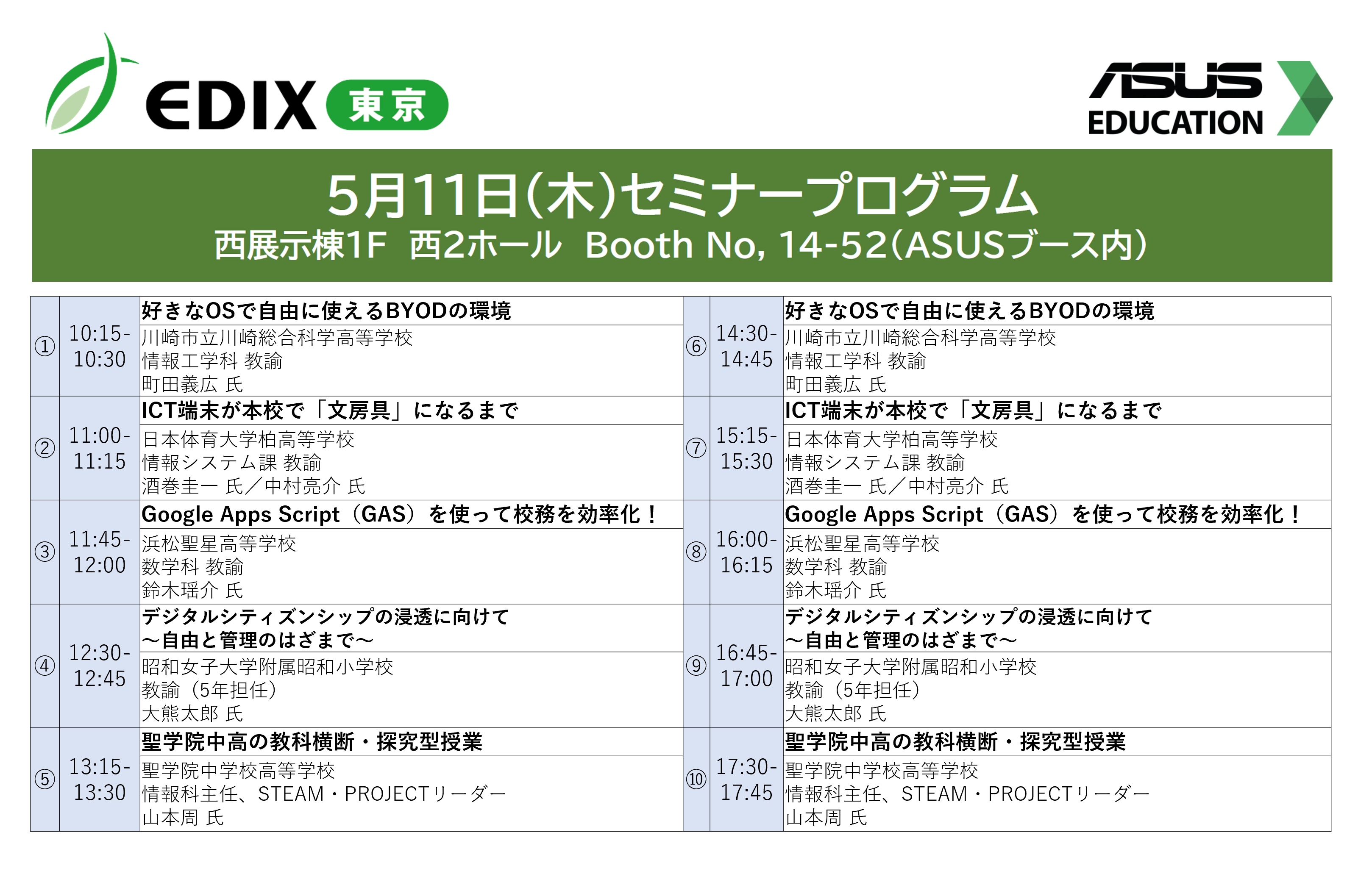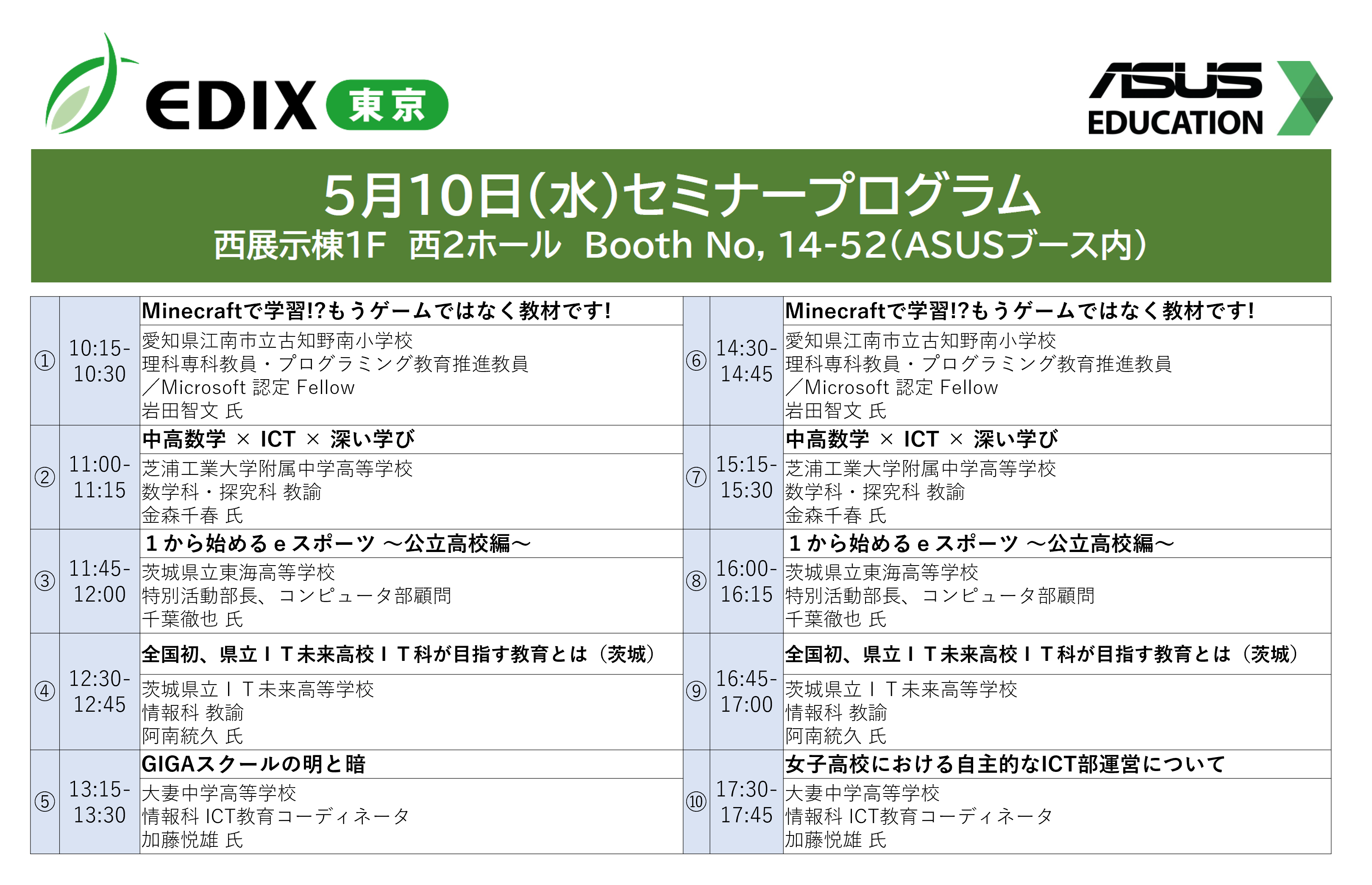 ASUSブースでは、法人、教育向けの端末の展示や、法人向けブランド「ASUS Expertbook」のご紹介をはじめ、最先端テクノロジー製品やeスポーツ部にも最適なASUSのゲーミングブランド「ROG(アールオージー)」をご体験いただける他、ASUSとかかわりの深い教育関係者のセミナーを実施いたします。またASUS出展特設ページ(https://www.asus.com/jp/events/infoM/activity_edix202)より事前登録お申込みいただくことで、入場無料でご来場いただけます。詳しくはプログラム一覧をご覧ください。