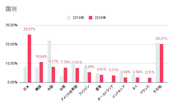 2019年と2024年の上半期を比較すると、チェックイン総数は9倍増となっており、下半期も利用者の増加が期待できます。国別の比較では、日本が約17%、台湾が約4%、韓国が約2%増加し、中国が約14%と大幅に減少、アメリカも約4%減少しています。2019年は、アメリカ、中国からの利用が多かったですが、2024年は特に国内中心の利用となり、利用国籍は様変わりしております。