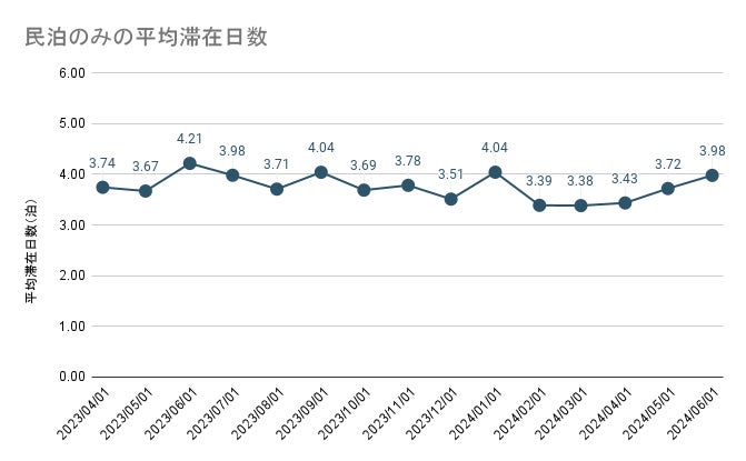 今回のレポートでは、宿泊したゲストの国別割合は日本国内が最も多く占めましたが、1,2,3月に比べると約8%減少しており、訪日客(インバウンド)の割合が増え活況であったことを示します。また、平均の宿泊滞在日数は、旅行が活発になる2月から5月は滞在日数が短くなっています。