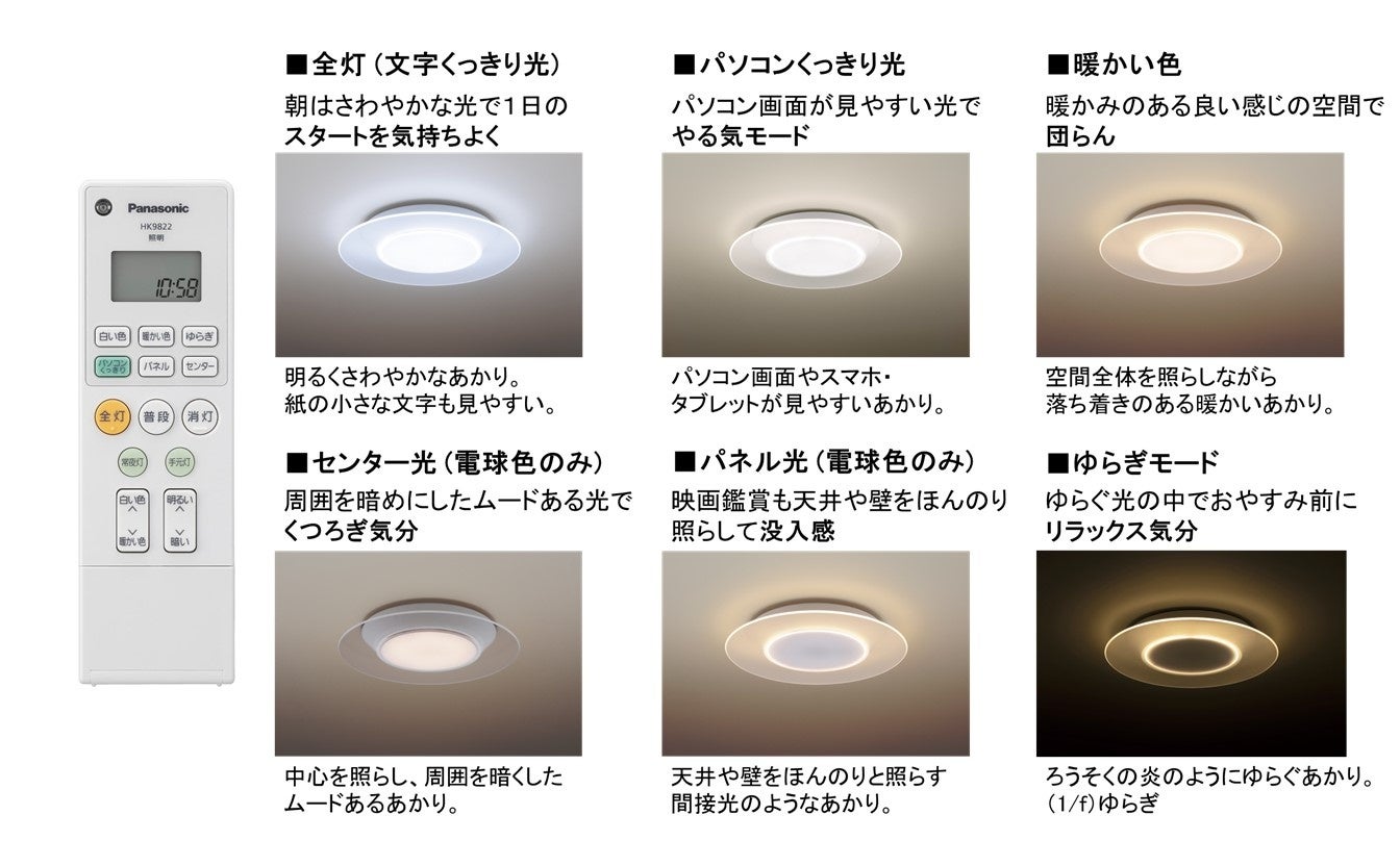 「パルック LEDシーリングライト パネルシリーズ(丸型タイプ)」(https://panasonic.jp/light/airpanel/2024-circle.html)は2024年10月21日の発売以来、雰囲気だけでなく気分も変える照らし分けが好評で、計画を上回るペースの販売となっています。従来のパネルシリーズの照らし分け(全灯・暖かい色・センター光・パネル光他)に加えて、パソコン画面が見やすい光で勉強や仕事がやる気モードになる「パソコンくっきり光」(※特許取得。特許第6735514号 パソコンくっきり光(5000K Duv-4))と、ろうそくの炎のようにゆらぐ光でおやすみ前にリラックス気分になる「ゆらぎモード」が搭載され、さらに多彩な照らし分けが演出でき、シーリングライトひとつで気分まで変えることができます。