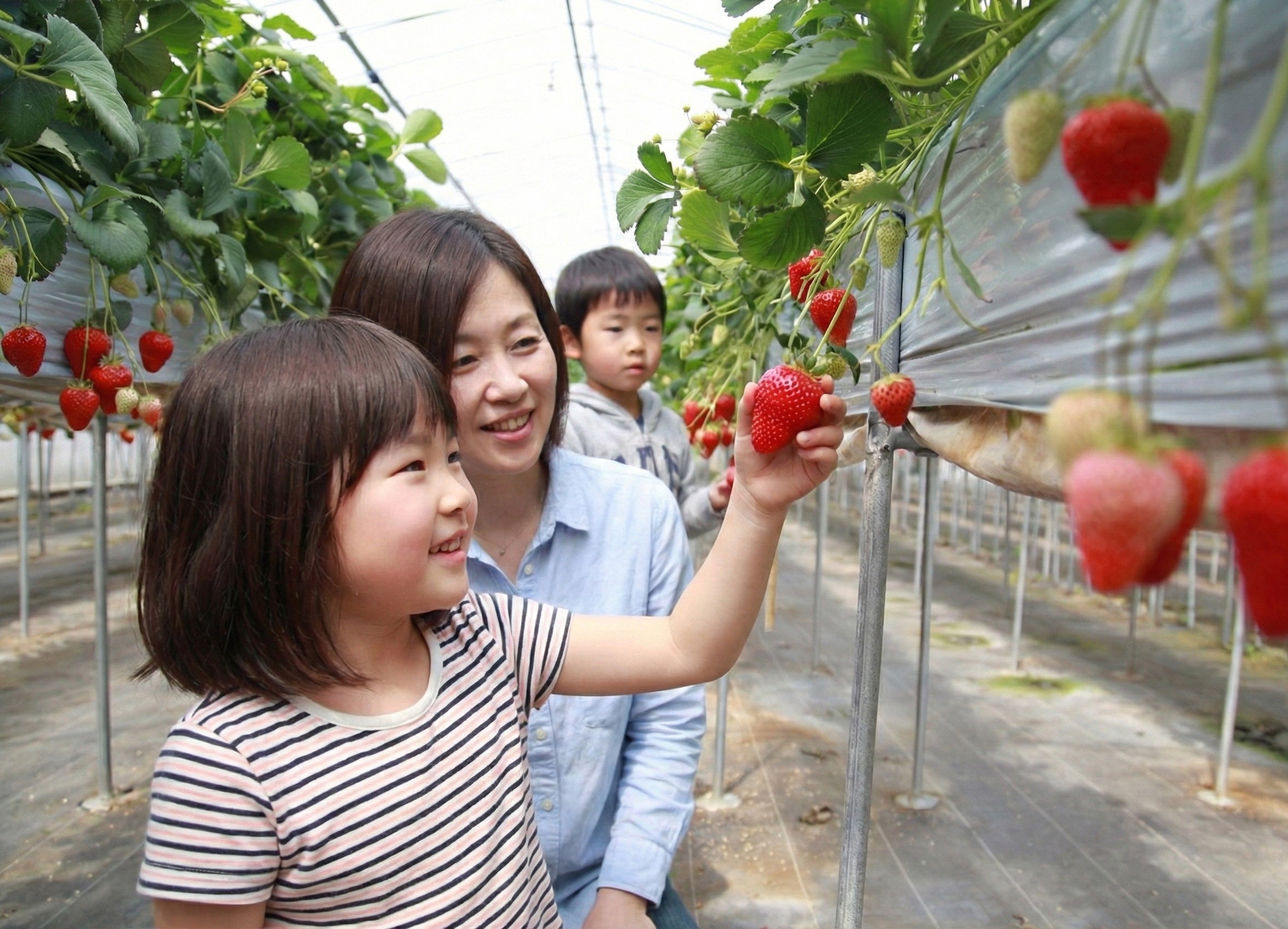 高設栽培は、大人の腰ほどの位置に実がなるため、足腰への負担が少なく、お子さまもイチゴを見つけやすいことから、幅広い世代の方に人気です。