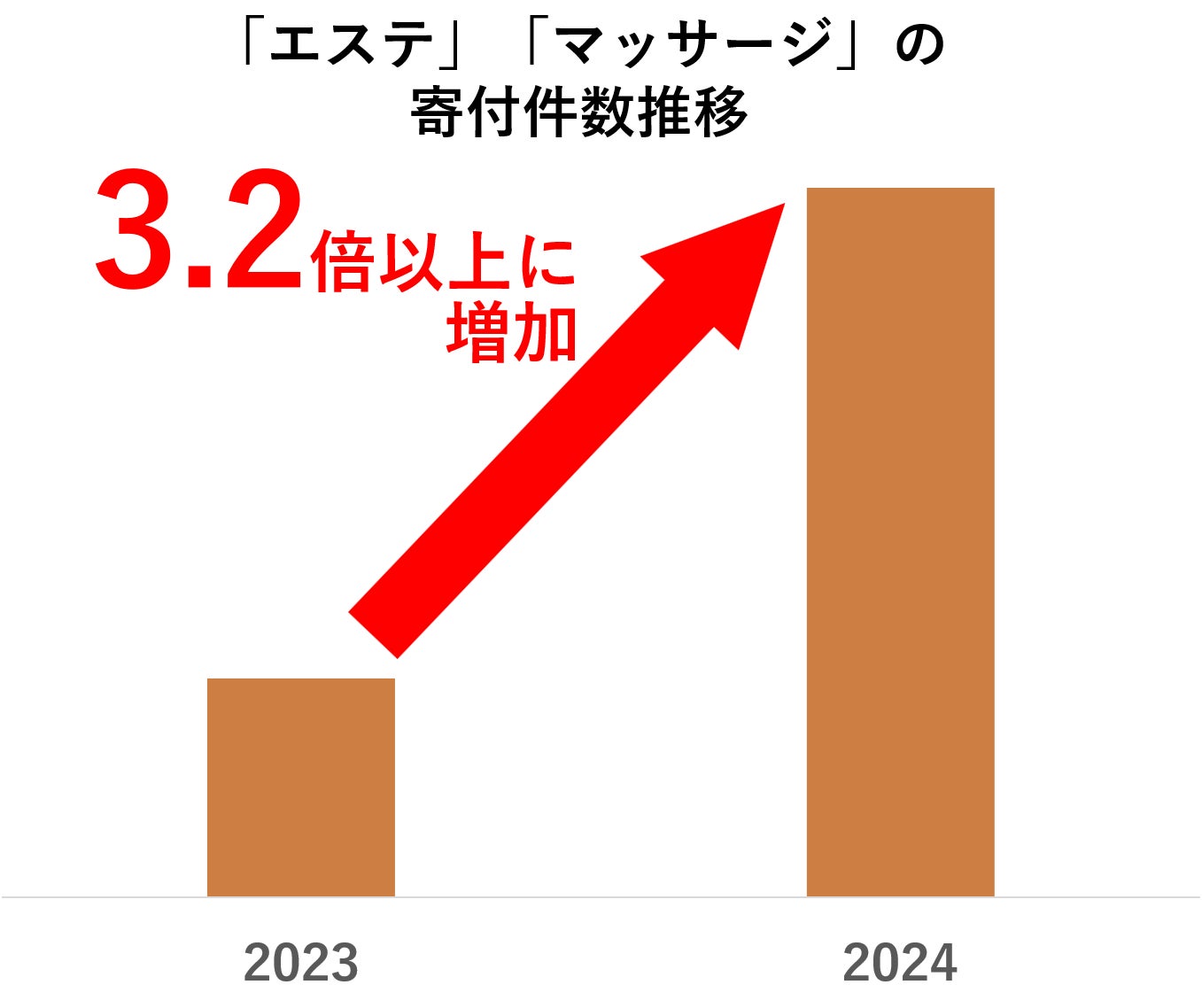 2024年の「エステ」および「マッサージ」などの美容関連の体験型お礼品の寄付件数は、前年比で3.2倍以上に増加(※5)しました。さらに、2023年~2024年の「エステ」および「マッサージ」お礼品の登録件数は、過去2年間と比較して4倍以上に増加(※6)しました。