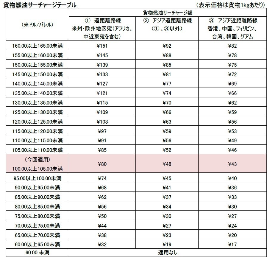 JALは、2024年4月1日から適用となる日本発国際貨物燃油サーチャージを国土交通省へ申請しました。基準となる2024年2月のジェット燃料の平均価格が1バレル当たり103.30米ドルであったことから、燃油指標価格を「100.00以上105.00未満」とし、サーチャージ額は1kgあたり80円(米州・欧州など遠距離路線)、48円(アジア遠距離路線)、43円(アジア近距離路線)となります。