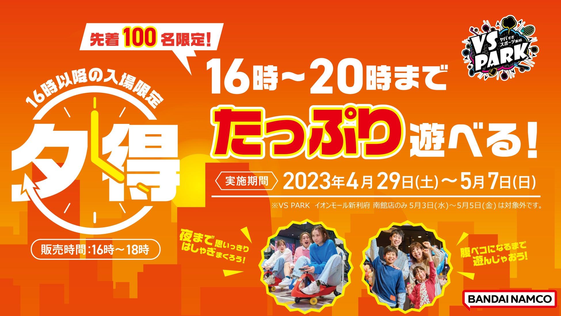 株式会社バンダイナムコアミューズメントが運営する新感覚バラエティスポーツ施設『VS PARK』では、2023年4月29日(土・祝)から5月7日(日)※1までの期間、16時以降最大4時間たっぷり遊べる「夕得」をVS PARK3店舗限定で実施します。