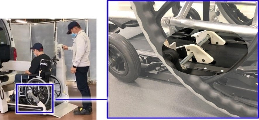 本装置は、車いす利用者がより自由な移動を実現するための装置として、トヨタ自動車により開発が進められています。車いす利用者様がデイサービス送迎車を利用する際、これまでは所定位置まで移動後、介助者が屈み、手動でフックのついたワイヤーを車いすにかけ固定する方法が主流でした。本装置では、所定位置まで移動後、スイッチを押すだけで、2秒で誰でも簡単かつ確実に固定することが可能です。
