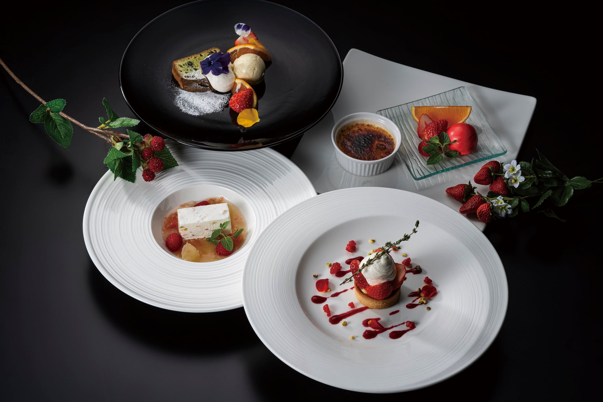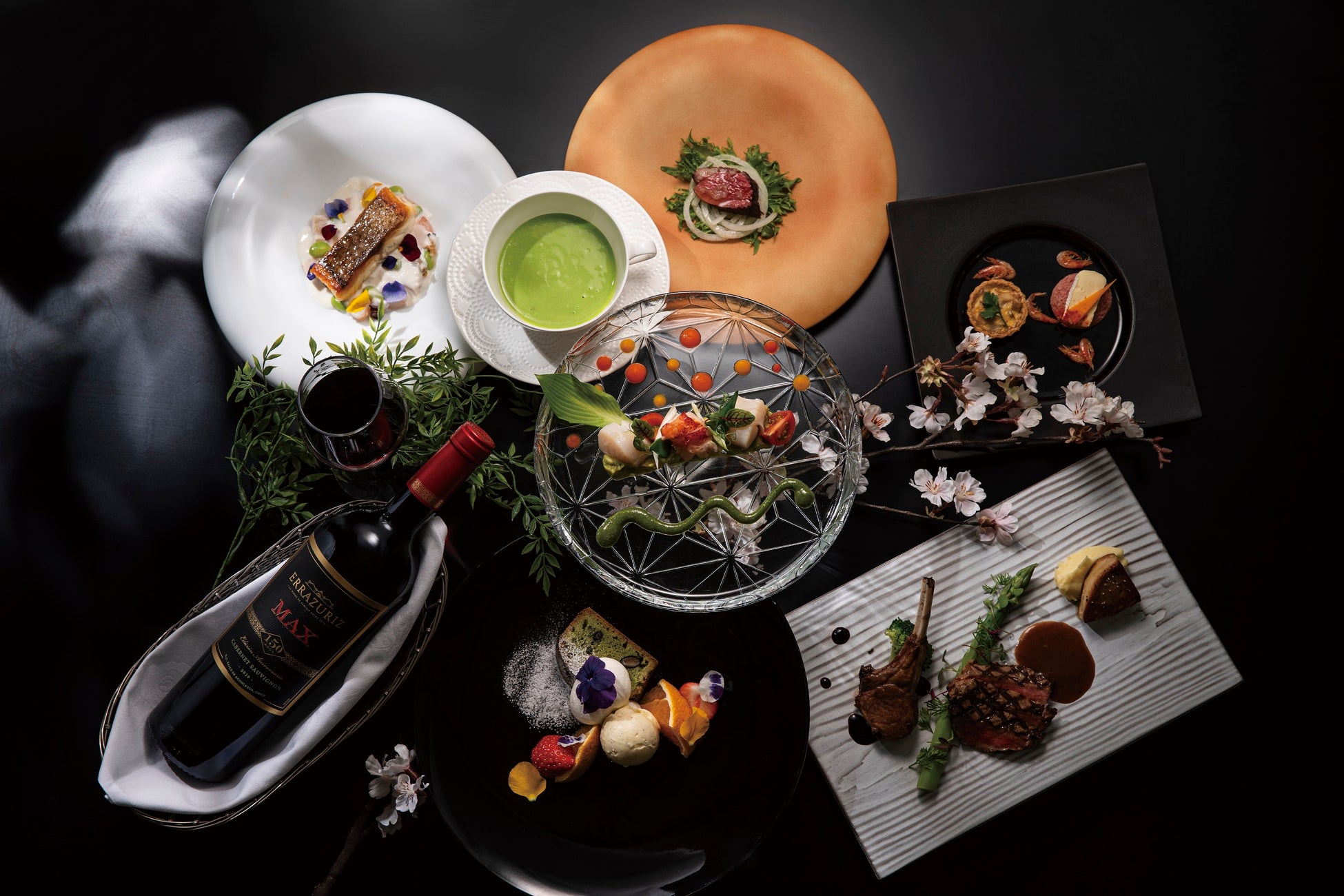 宮崎牛やフォワグラのソテー、仔羊の3種を盛り合わせた豪華なメイン料理のほか、オマール海老や鴨、アミューズを取り入れるなど今まで以上に贅沢な内容のメニューです。デザートはこの時期を華やかに彩る桜や抹茶のスイーツなど4種からお選びいただけます。