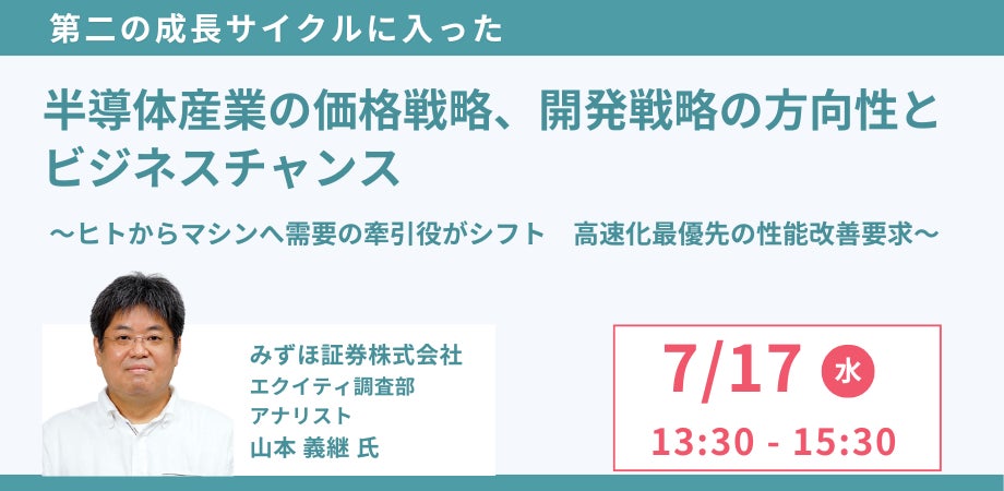 山本 義継 氏を招聘し、半導体産業の価格戦略や開発戦略の方向性とビジネスチャンスについて詳説いただくセミナーを開催します。