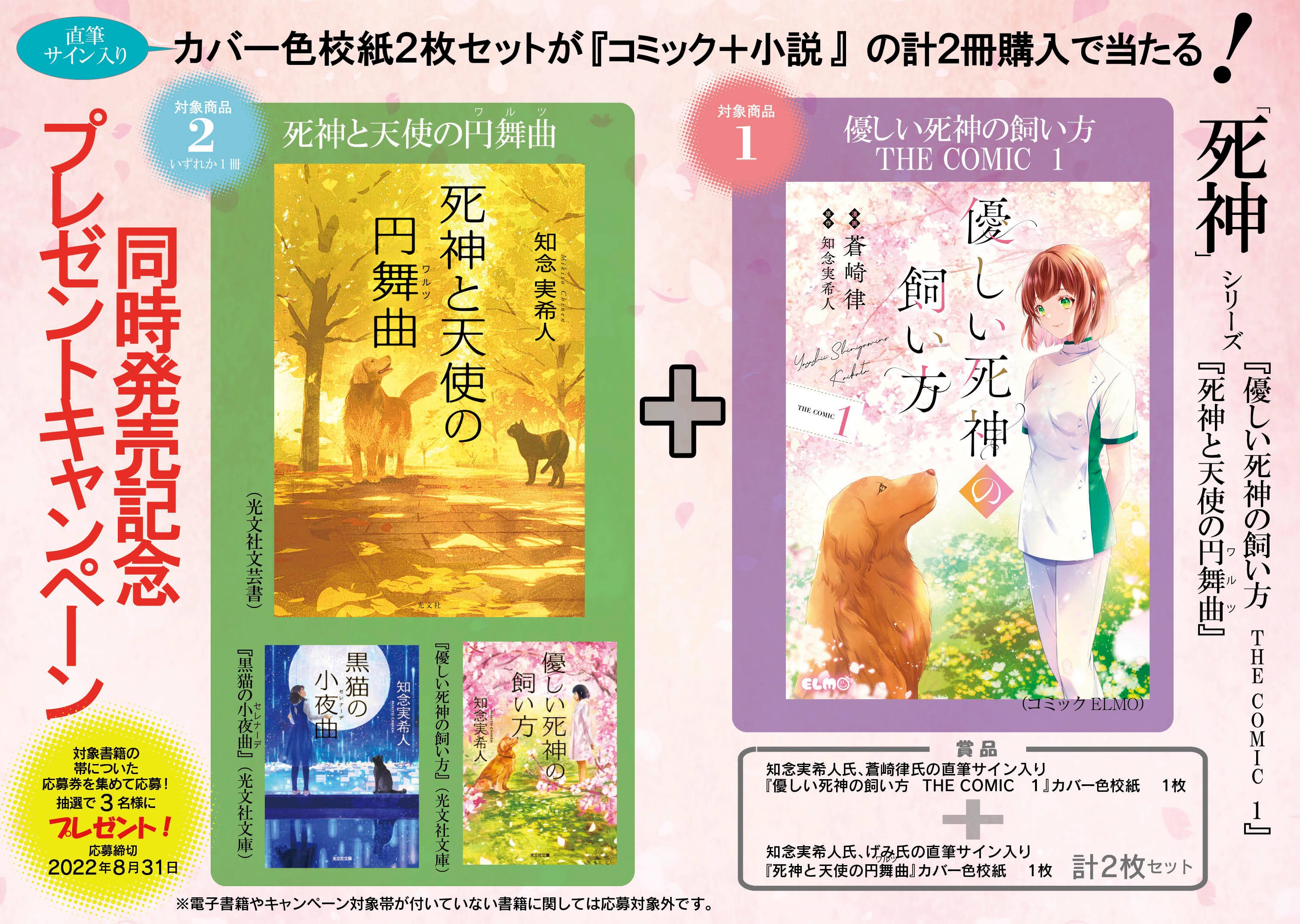『死神と天使の円舞曲』と『優しい死神の飼い方 THE COMIC 1』(原作者:知念実希人氏、イラストレーター:げみ氏、漫画家:蒼崎律氏)の直筆サイン入りカバー色校紙をセットでプレゼントいたします。