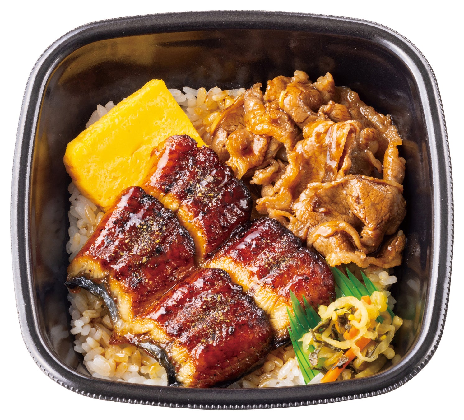 『牛すきうな重(2切れ)』は、醤油ベースの甘めのタレで味付けした「牛すき」を、香ばしいうなぎと一緒に味わえる一品です。やさしい味わいの「だし巻き玉子」を添えた、バランス良い仕立てとなっております。