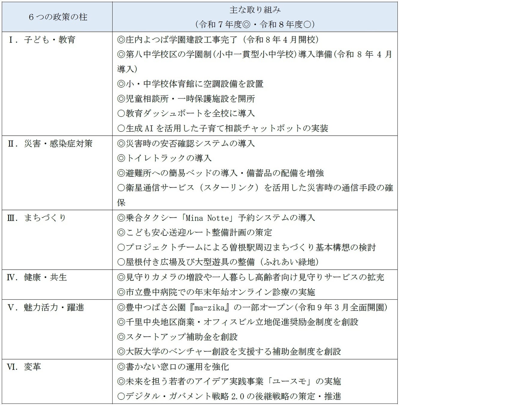 豊中市は、市長の掲げる基本理念「未来につなぐまちづくり~「創る改革」とよなか 夢 みらい~」に基づき、任期中に取り組む基本政策として、70の政策項目からなる6つの政策の柱の進捗状況を毎年度公表します。