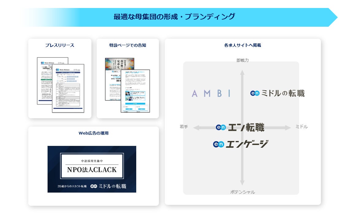 プレスリリースや特設ページ、Web広告での告知に加え、各求人サイトでの集客支援を実施。『エン転職』『エンゲージ』『AMBI』『ミドルの転職』とターゲットの異なる求人サイトを活用することで、ターゲットへ網羅的に求人を届けます。