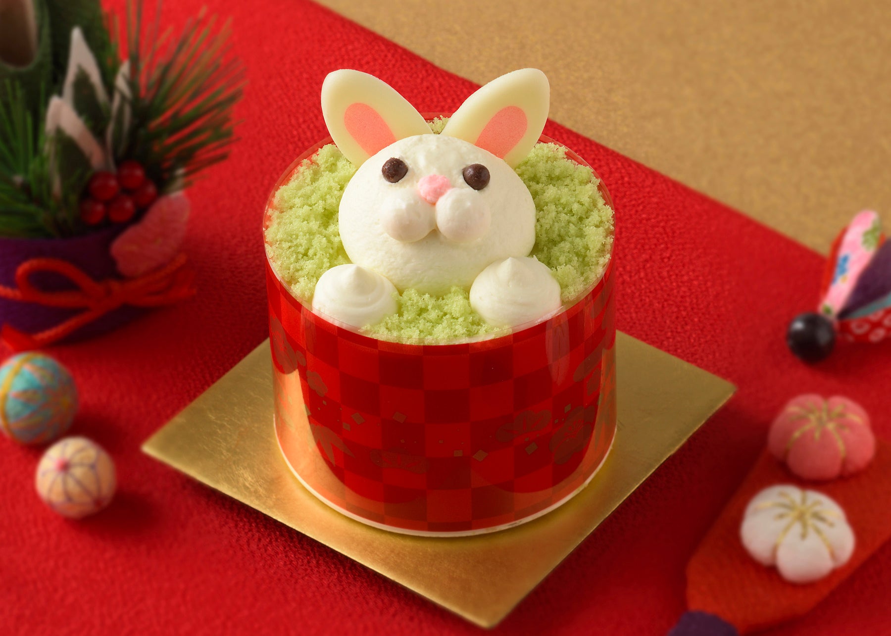 2023年の干支「うさぎ」をモチーフにしたキュートなお正月限定ケーキです。苺クリームをふんわりスポンジでサンドし、ホワイトチョコクリームのうさぎの周りにホワイトチョコクリームで形作り、周りに抹茶スポンジを散りばめました。