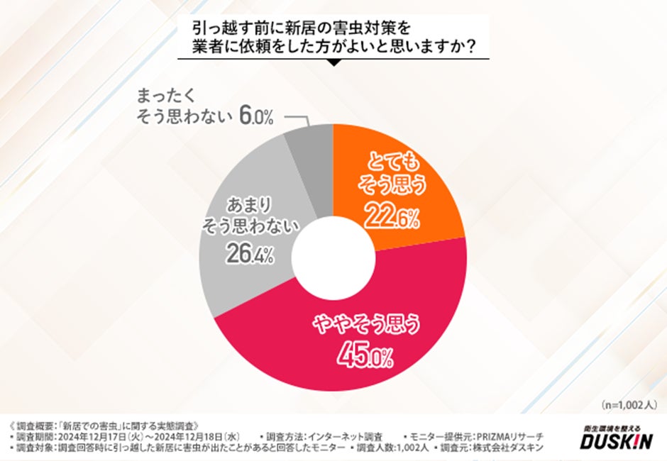 引っ越す前に新居の害虫対策を業者に依頼をした方がよいと思うかについて質問したところ、6 割以上の方が『とてもそう思う(22.6%)』『ややそう思う(45.0%)』と回答しました。前の質問でも害虫が出る原因や侵入してくるすき間を⾒つけるのは難しいことがわかっており、新居に害虫が出ないようにするには、引っ越す前にプロに依頼することが⼤切だと考える⼈が多いようです。