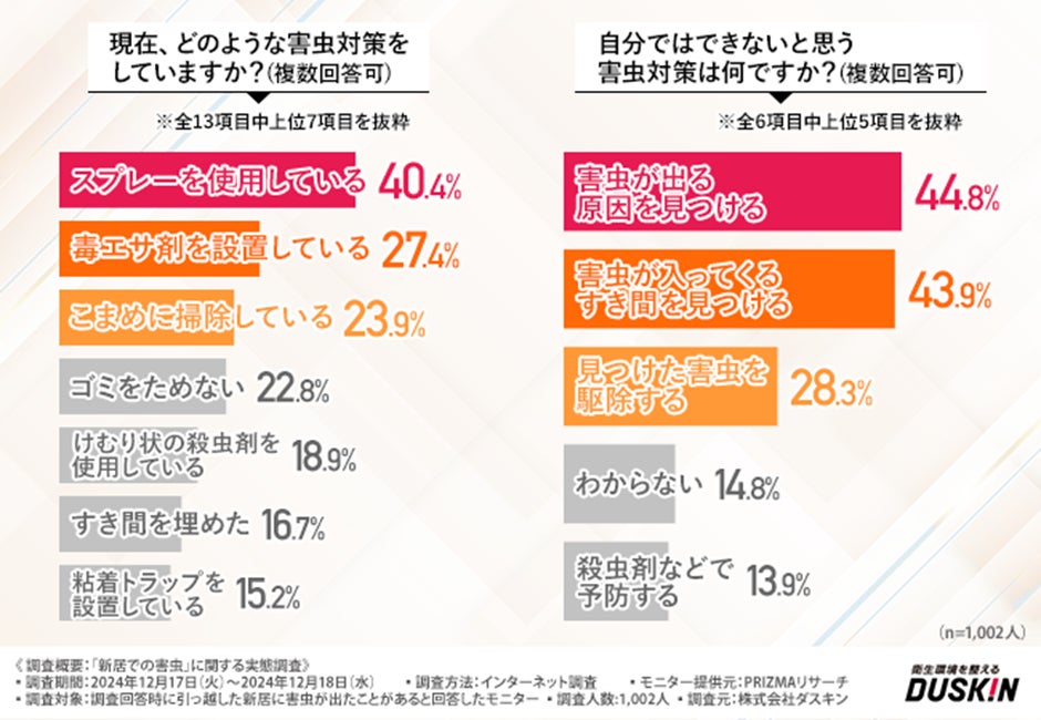 株式会社ダスキン(本社所在地︓⼤阪府吹⽥市、社⻑︓⼤久保裕⾏)が展開する、ターミニックス事業(害虫獣の駆除と総合衛⽣管理)は、3〜4 月の引っ越しシーズンにあわせて、引っ越した新居に害虫が出たことがある方、1,002 名を対象に「新居での害虫」に関する実態調査を実施しました。