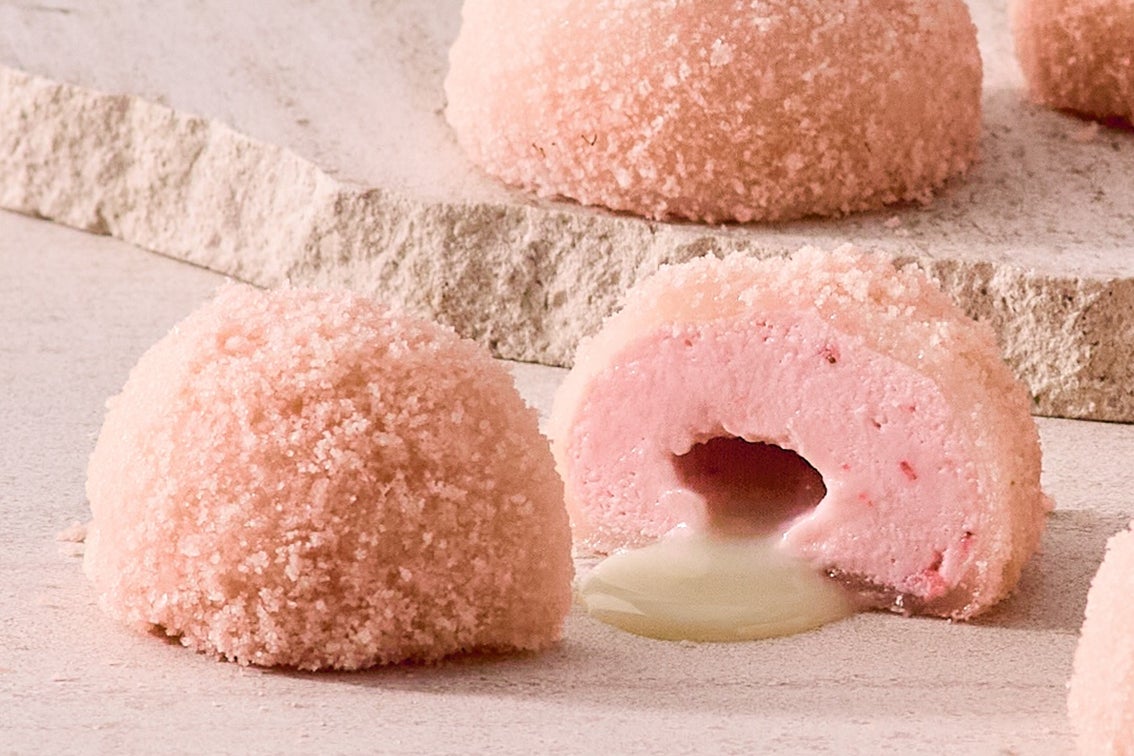 オーストラリア産のクリームチーズとサワークリームをベースに、苺のピューレや果肉ソースを贅沢に使用。爽やかな酸味とクリーミーなコクが絶妙に調和した苺チーズムースを、もっちりとした餅生地で包み、春色のふわふわクラムをまとわせました。