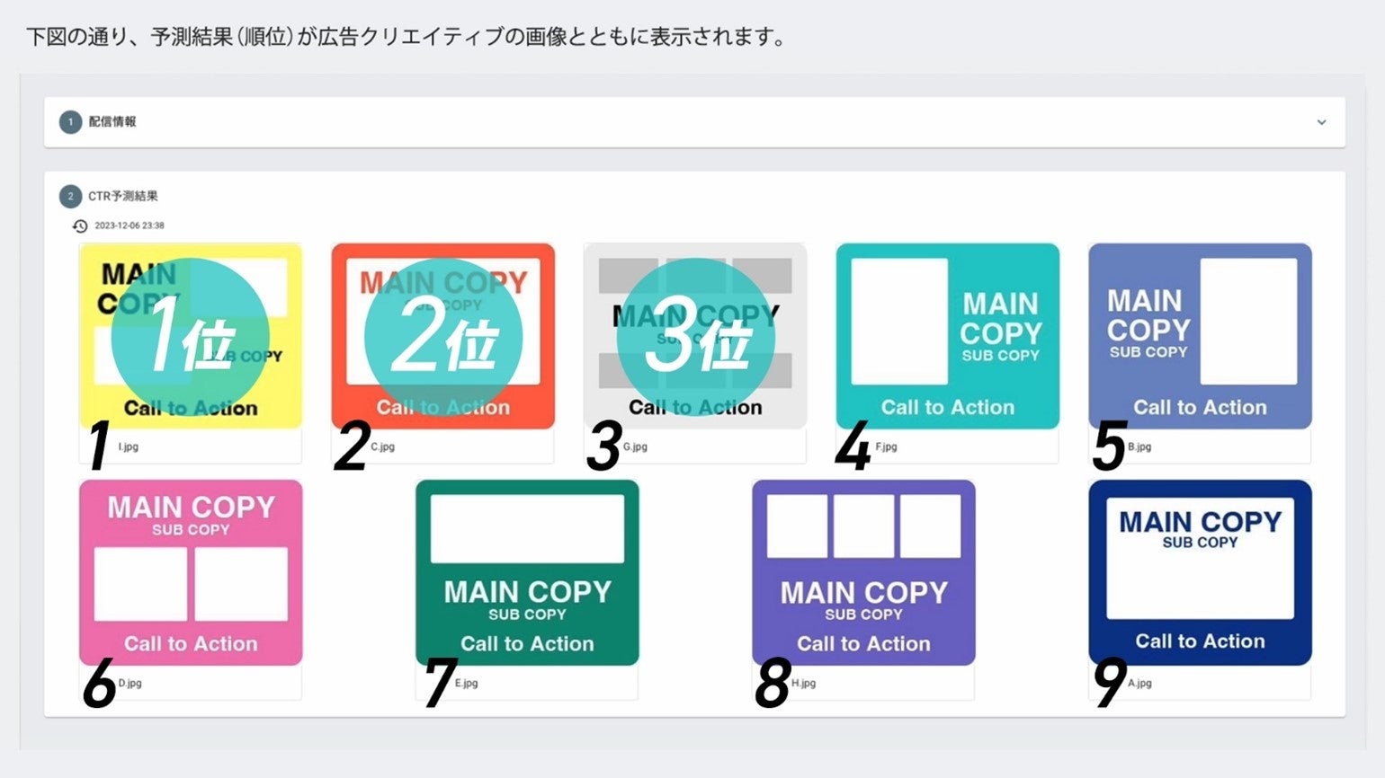 また、CTR予測をもとに効果が高いとされる原因を追求し、クリエイティブを入稿する前にクリエイティブのPDCAを実施することも可能です。