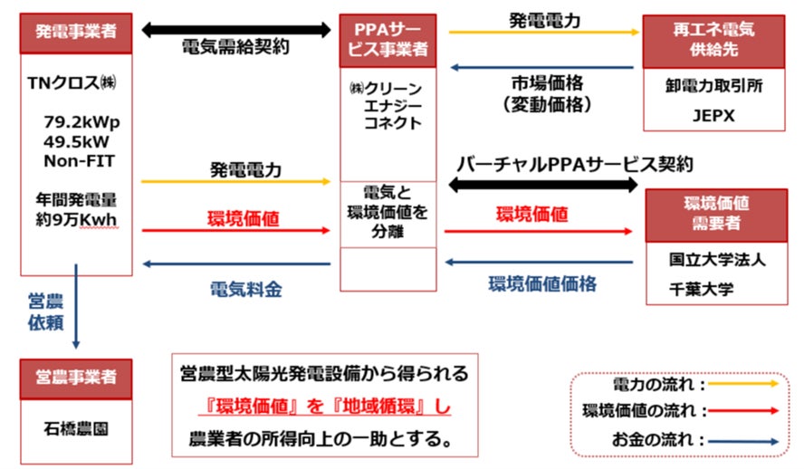 千葉大学は、2025年5月30日から、千葉市内の水田に設置された営農型太陽光発電設備で発電した電気の環境価値(注)を購入します。この設備は、「千葉市営農型太陽光発電モデル事業検討協議会」(会長:千葉大学倉阪秀史)が交付を受けた「農林水産省の令和5年度みどりの食料システム戦略推進交付金(地域循環型エネルギーシステム構築)」を活用して、千葉エコ・エネルギー株式会社(本社:千葉県千葉市、代表:馬上丈司)が設計し、TNクロス株式会社(本社:東京都千代田区、代表:荒木登)が設置したものです。この設備で発電された電気を株式会社クリーンエナジーコネクト(本社:東京都千代田区、代表取締役:内田鉄平)が購入し、クリーンエナジーコネクトが電力と環境価値に分離し、この環境価値分を千葉大学が購入することとなります。