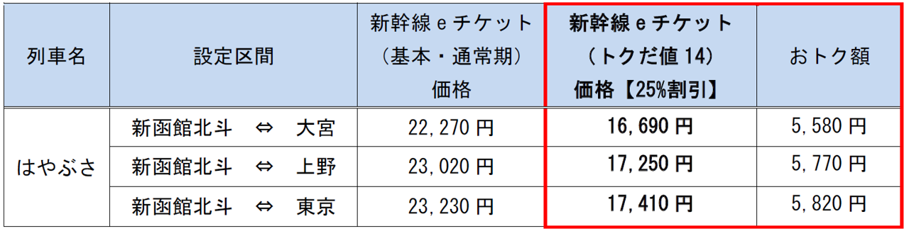 首都圏からのご利用「東京・上野・大宮⇔奥津軽いまべつ・木古内・新函館北斗」の区間ではと「新幹線eチケット(トクだ値14)」(25%割引)と「新幹線eチケット(トクだ値1)」(5%割引)を引き続き設定すると共に、通常よりも座席数を拡大設定します!