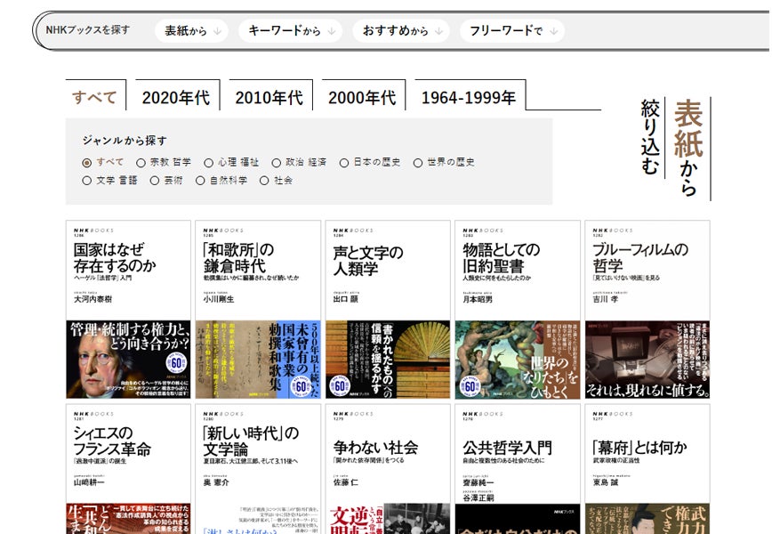 現在販売中のNHKブックス全点を、ジャンルや年代ごとに網羅。表紙から直感的に選書できる特設サイトをオープンしました。歴代発行部数ランキングや、ジャンル別人気商品を紹介するコンテンツも公開。あなたにぴったりの一冊がきっと見つかります。
