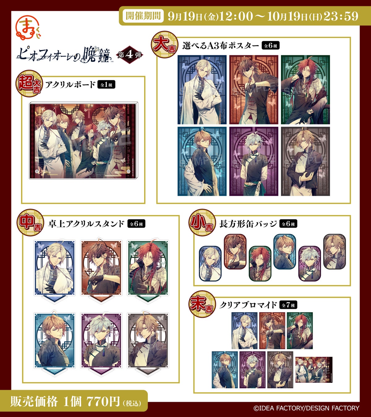 各賞の商品として、アクリルボード、選べるA3布ポスター、卓上アクリルスタンド、長方形缶バッジ、クリアブロマイドなど、この機会にしか手に入らないプレミアムアイテムをお見逃しなく!