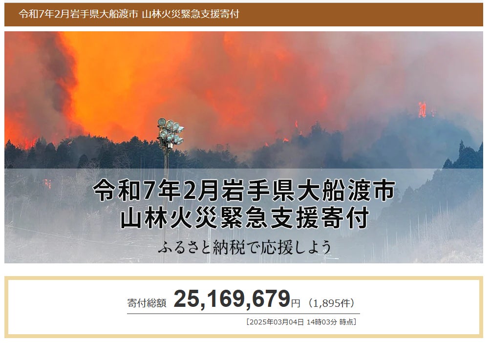 さとふる、「令和7年2月岩手県大船渡市 山林火災緊急支援寄付サイト」にて2,500万円以上の寄付が集まる
