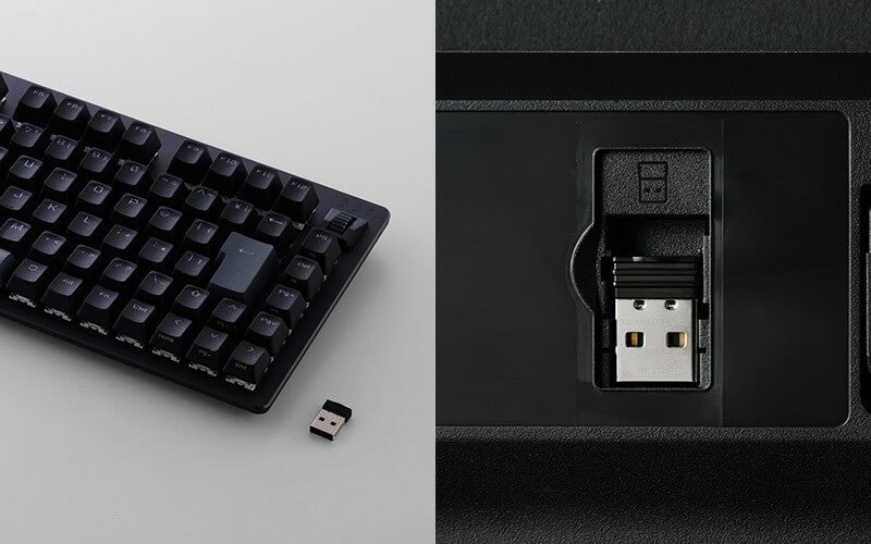付属の2.4GHz無線接続用USBレシーバーは、キーボード本体(底面部)に収納できるため、紛失の心配がありません。