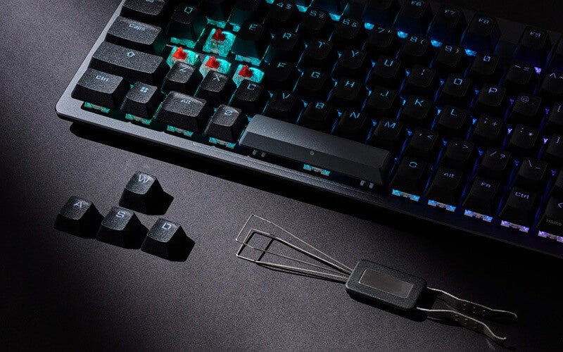 ゲームに精通したプロジェクトチームが手がけた、操作性に優れたキーデザインを採用するほか、キー印字には摩耗しにくいキーキャップと視認性に優れたオリジナルフォントを使用。さらに、新開発のゲーミングエンジンにより、応答速度・精度・安定性を向上させています。ホットスワップ方式によるキースイッチ交換やスペースキーのカスタマイズも可能です。また、1,677万色RGBライティングを搭載し、専用ソフトを使ってキー割り当てやライティングのカスタマイズが可能です。今後、ロープロファイルモデルの発売も予定しています。