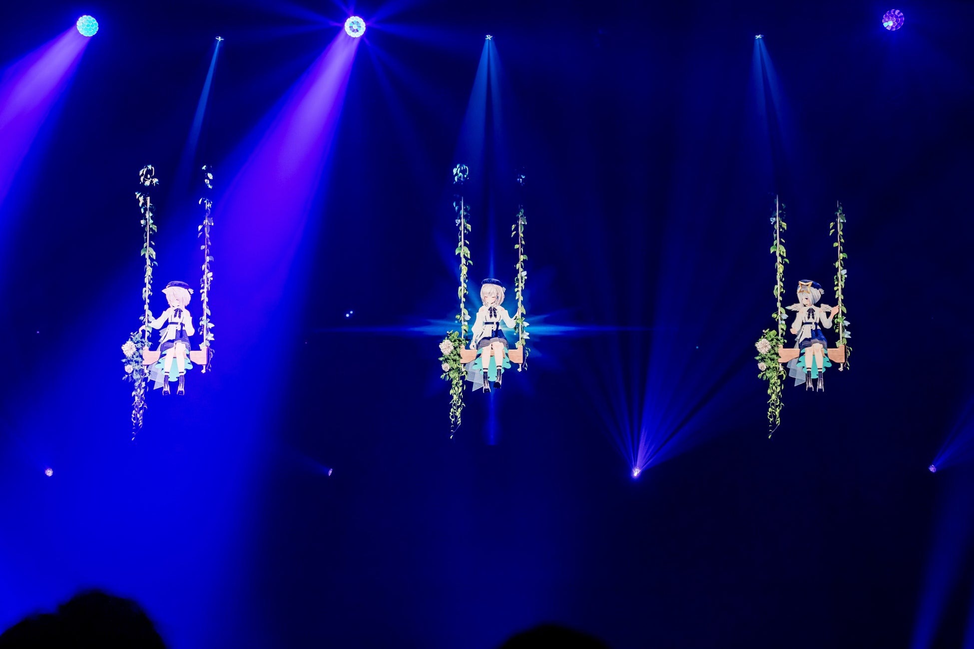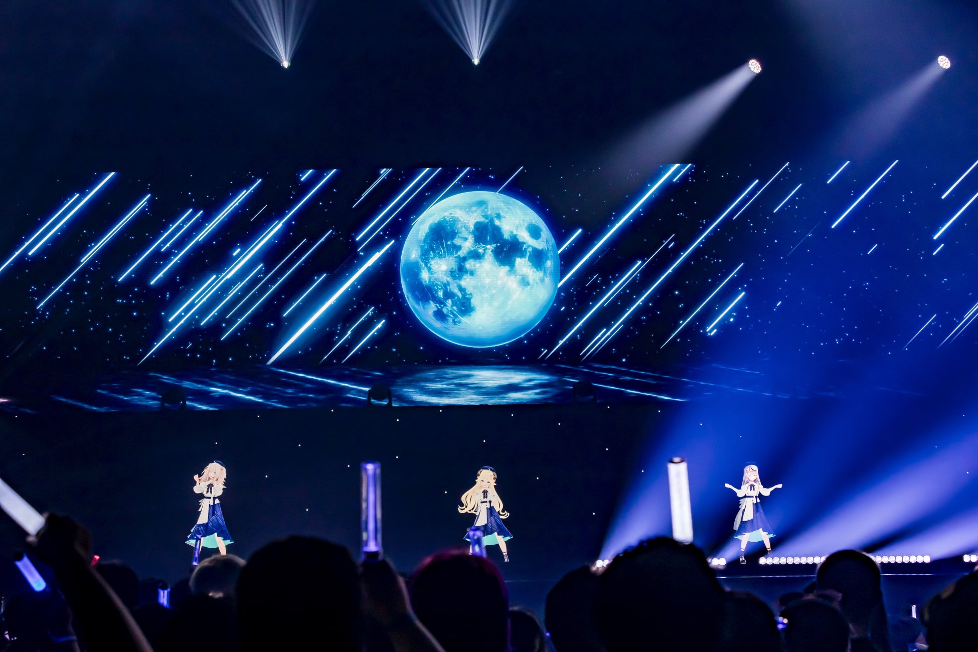ステージ上方から蔦の絡まったブランコに乗った猫又おかゆ、白銀ノエル、天音かなたが登場し、披露されたのは「astro」。ふんわりとポップなサビを持つ楽曲が3人の声色にマッチ、別れの先にある希望の光を感じさせてくれる。中盤からはブランコを降り、星空をバックにしなやかな振りを交えながら歌唱するパフォーマンスも素晴らしかった。