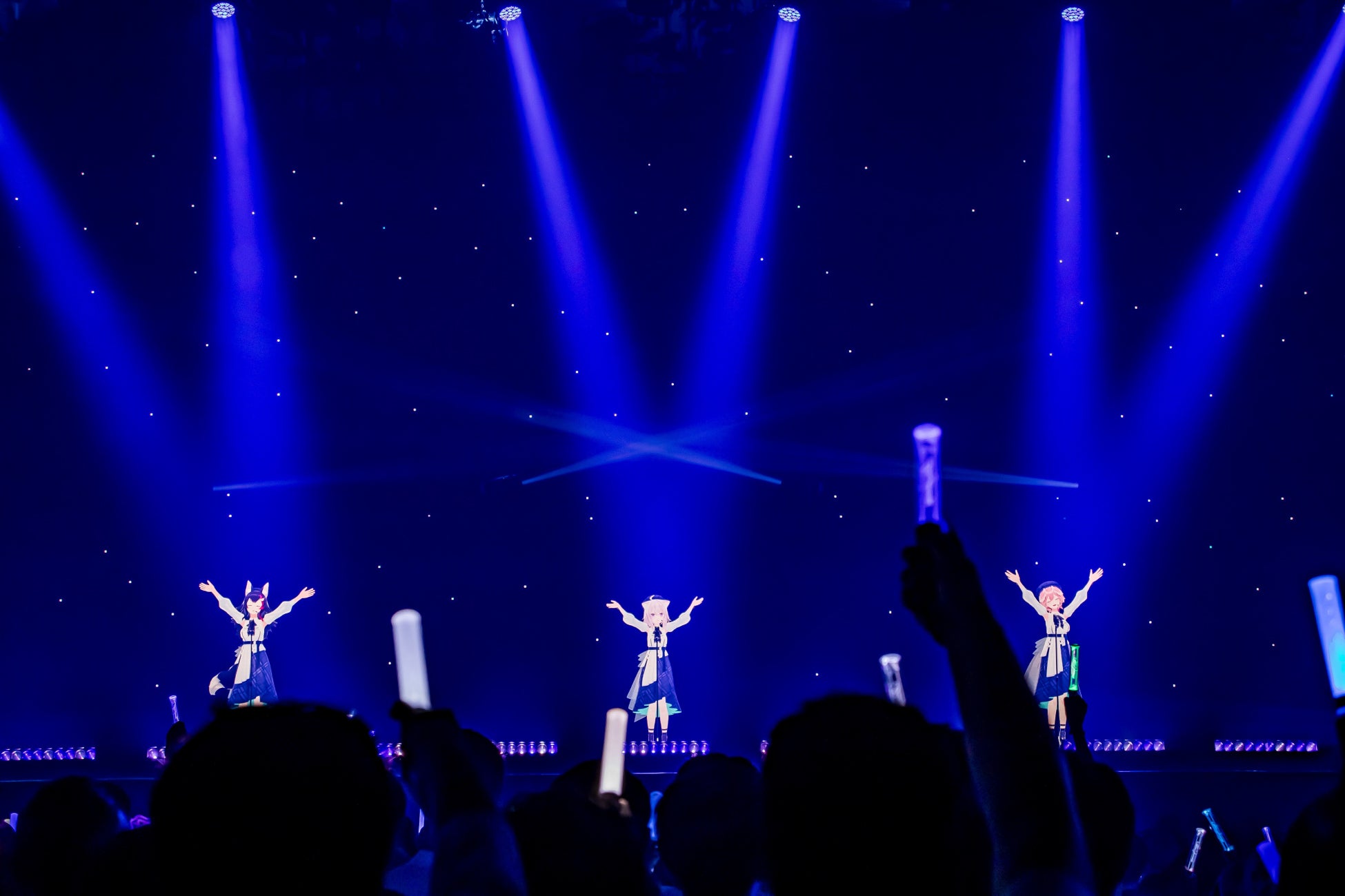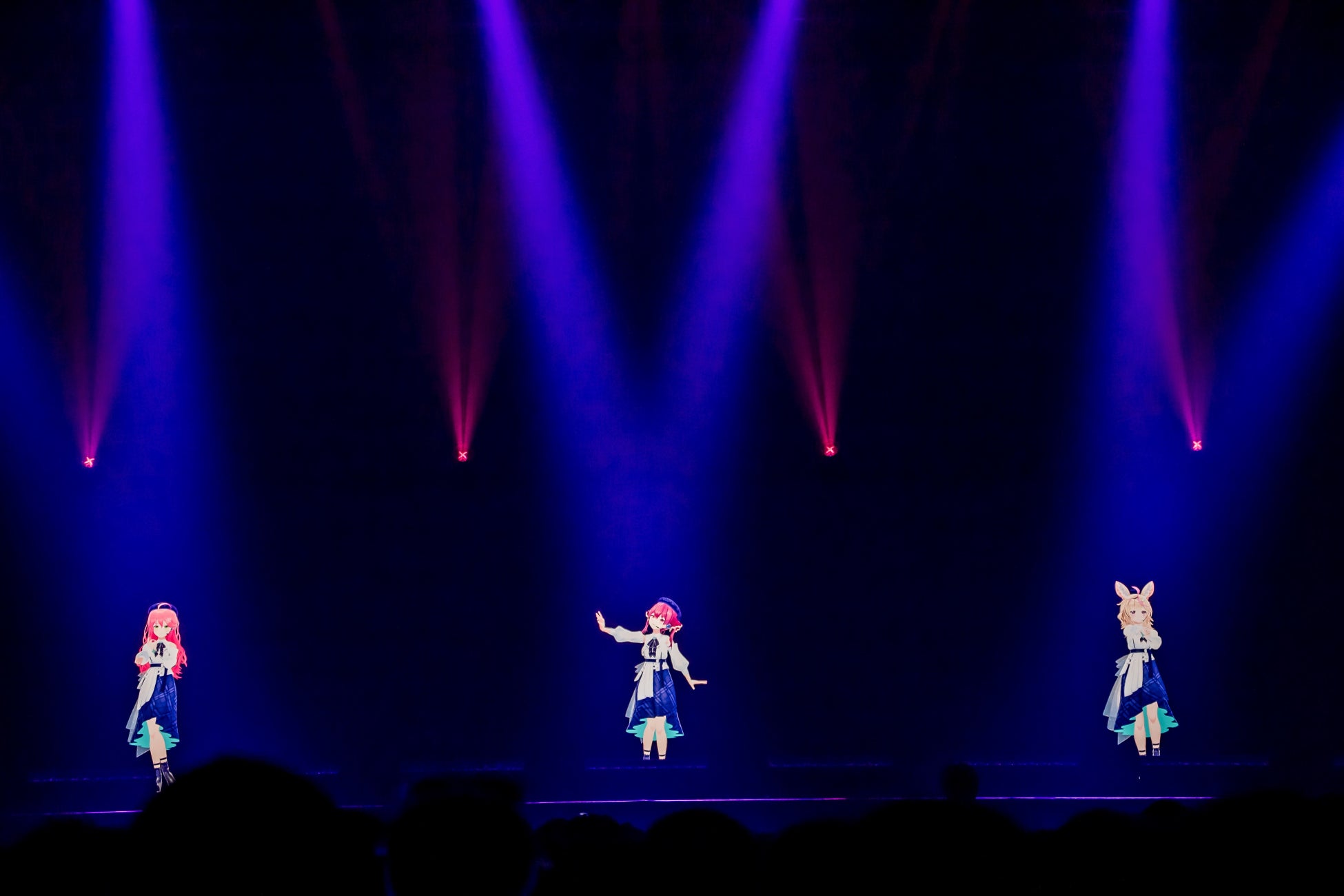 「Blue Journey 1st Live「夜明けのうた」へようこそ。今夜はみなさんとともに旅に出たいと思います」という不知火フレアによる短いMCを合図にスタートしたのは、不知火フレア、常闇トワ、尾丸ポルカによる「また傷に触れる」。主メロを歌うメンバーの後ろで、他の2人が違った歌詞とメロディを重ねていく多層的な構成を持つサビでは、主人公の心の中の思いまでもが鮮明に浮かび上がっていく。中盤の「♪ラララ」パートでは、「Blue Journey」のイメージカラーであるブルーやホワイトに灯されたペンライトが左右に大きく揺れる美しく感動的なシーンも生まれた。