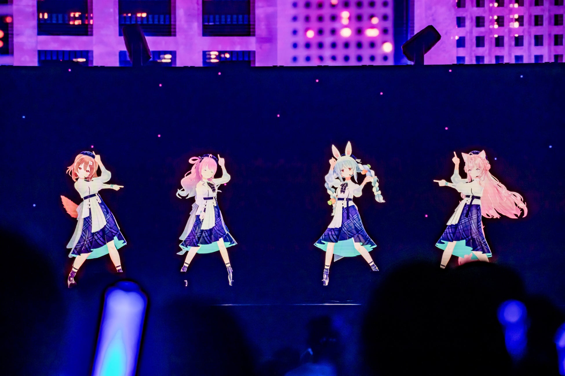 スリリングなピアノのイントロで会場を一瞬で掌握したのは戌神ころね、兎田ぺこら、姫森ルーナ、博衣こよりによる「不純矛盾」。今回のライブでは唯一の4人曲だけに、くるくると入れ替わる個性的なボーカルが楽曲をカラフルに彩り、ユニゾンのふくよかさにも特筆すべきものがあった。サビで見せる息の合ったダンスのキュートさによって、会場のテンションも大きく沸き上がっていった。