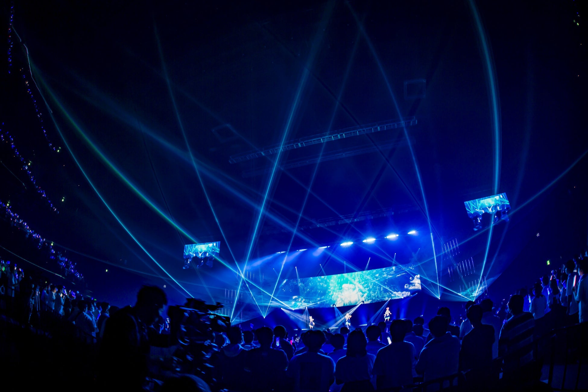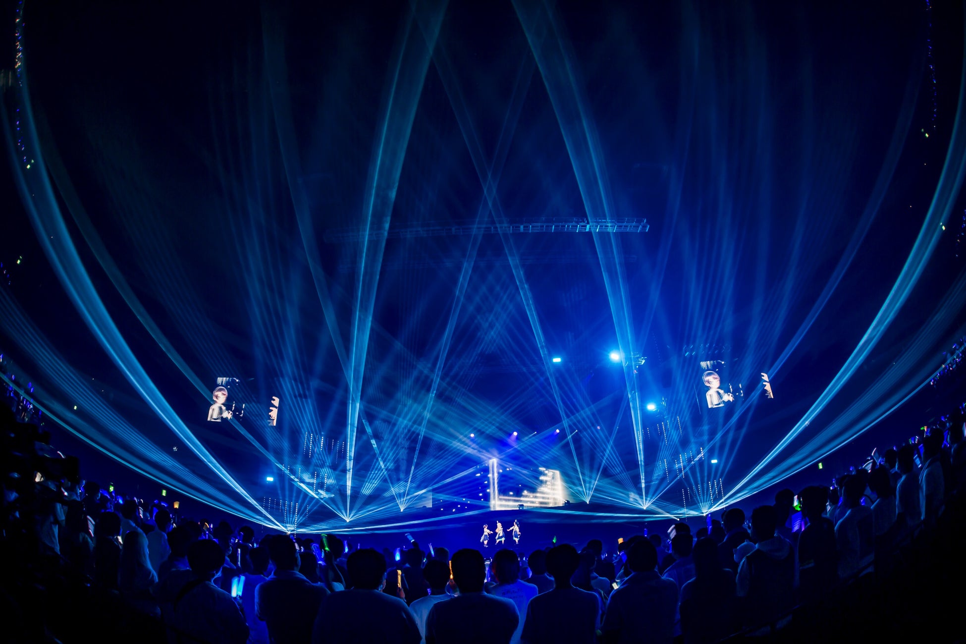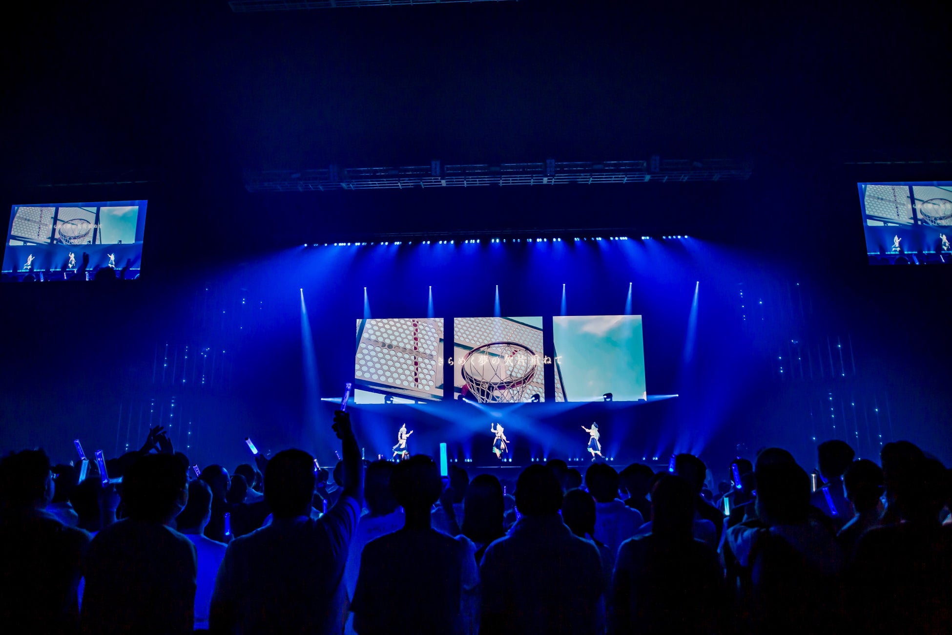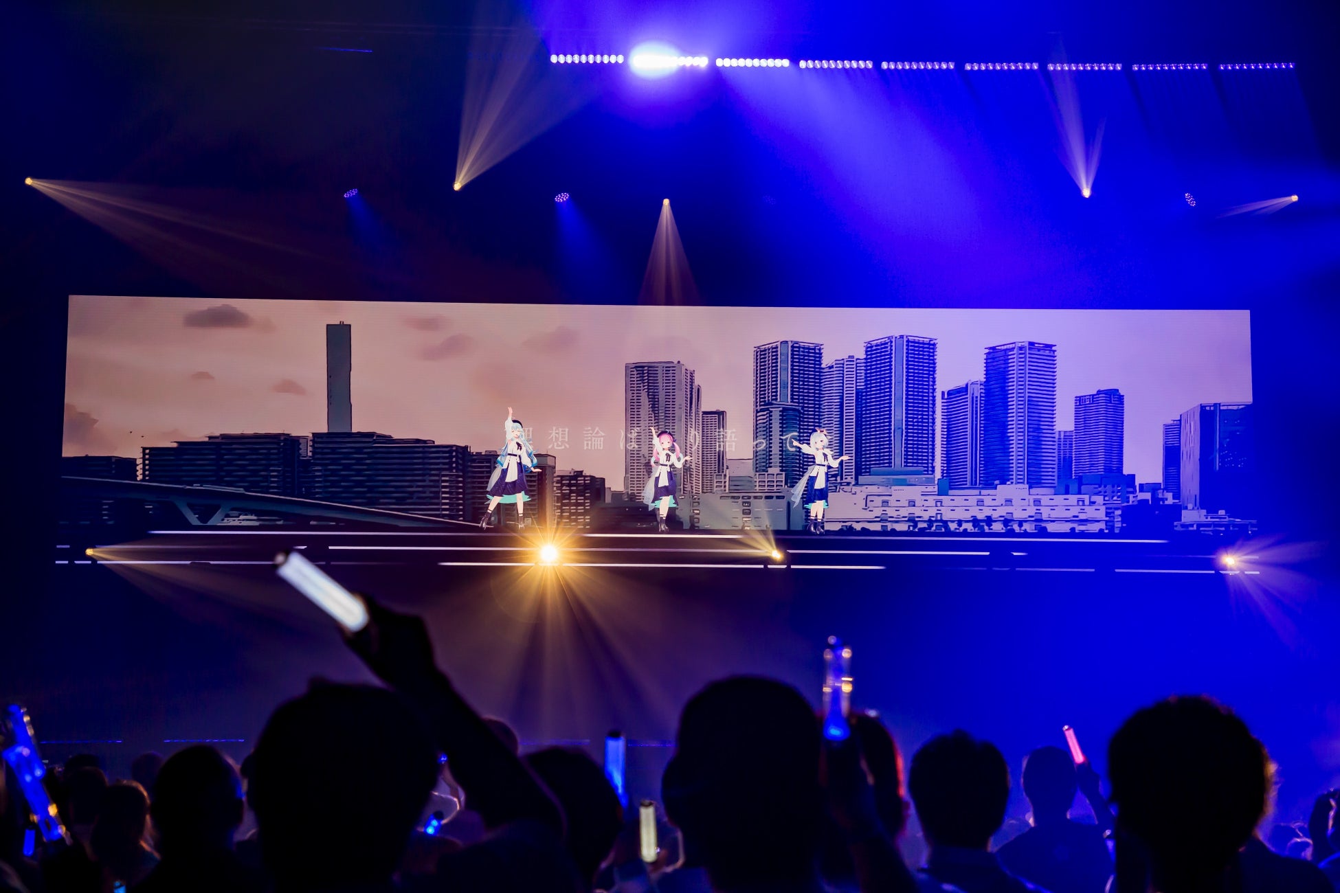 「あの日、言えなかった僕らへ」という湊あくあによる短い言葉の後、パフォーマンスされたのは「あの日の僕らへ」。乱立するビル群や流れゆく川の映像を背負いながら、ステージの2階部分で湊あくあ、天音かなた、雪花ラミィが、後悔の滲む“あの日”を乗り越えながら“今日”に思いを馳せていく心の動きを丁寧に歌へと落とし込んでいく。間奏で姿を消した3人が、大サビで1人ずつ1階部分に現れ、1フレーズずつ歌っていくという演出も。広い会場を存分に活かした演出の数々が、オーディエンスの胸にたくさんのハイライトとして刻まれていく。