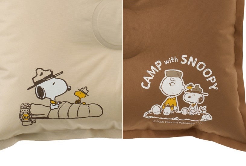 まくらには、寝袋に入ってくつろいでいるようなSNOOPYなど、スヌーピーやウッドストックたちが自然の中で冒険しているようなデザインが描かれています。リバーシブル仕様で、表はやさしい色味のベージュ、裏はあたたかみのあるブラウンで、その日の気分やシーンに合わせて使い分けができます。