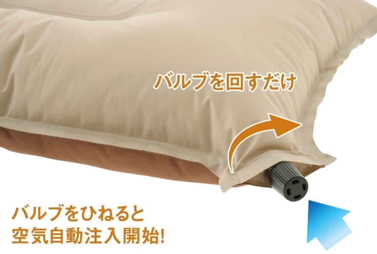 バルブをゆるめるだけで簡単に膨らみ、持ち運びにも便利なセルフインフレートまくら。空気の出し入れがスムーズで早い、ワイドバルブを採用。