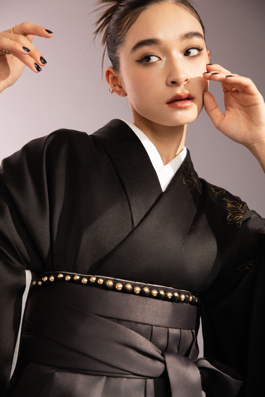 今回の新ビジュアルでは、職人の手により丁寧に黒染めされ金彩だけが浮き出た振袖に、メタリックゴールドのアクセントを加えたスタイリングを採用。光沢感のあるヴィーガンレザー袴と組み合わせることで、洗練されたハンサムクールな印象を演出しています。